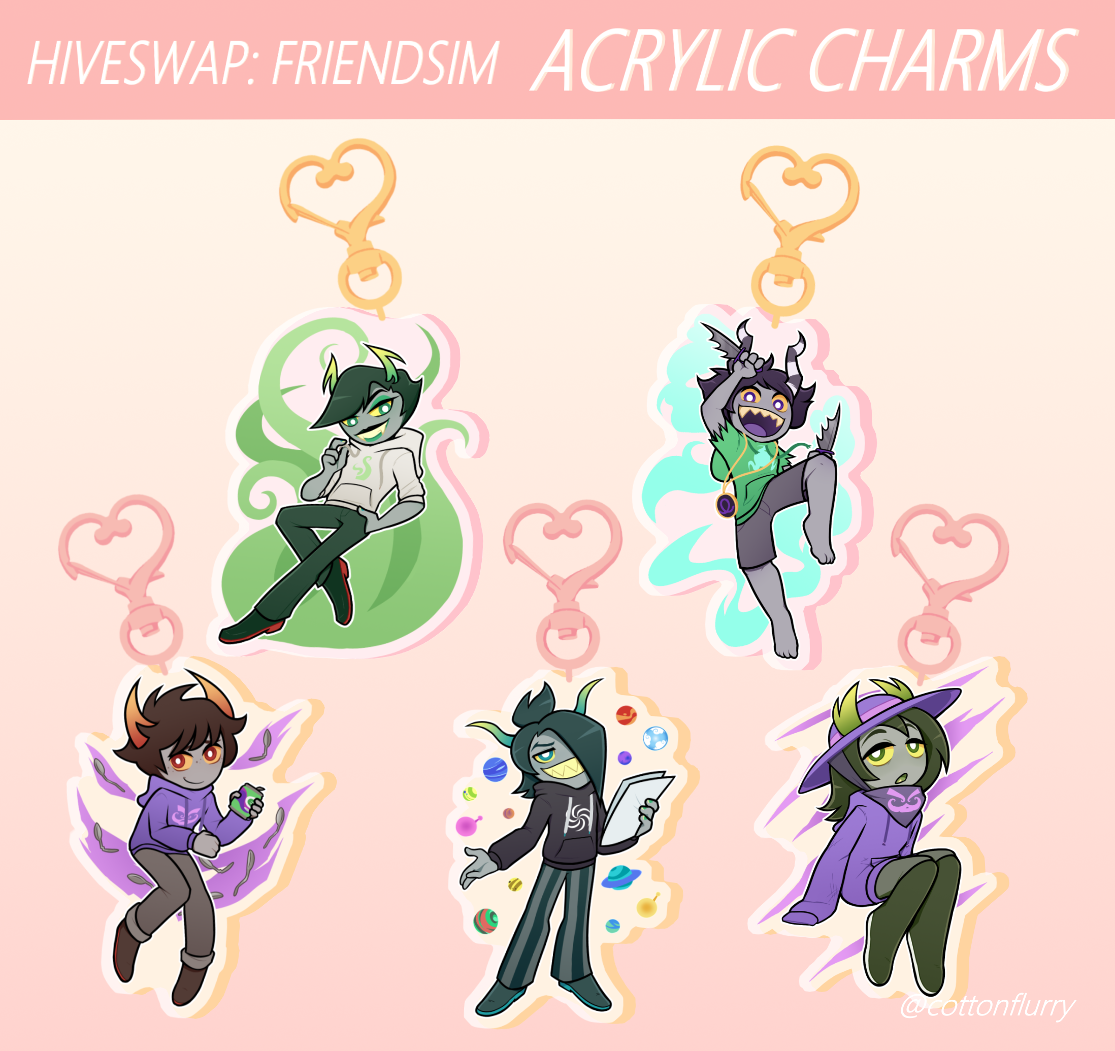♥ 2.5 in. glitter epoxy acrylic charms based off of Hiveswap: Friendsim trolls ♥ Illustrated by cottonflurry on Twitter ♥ Double-sided print ♥ Gold heart accessory clasp for Prospit dreamers, Pink heart accessory clasp for Derse dreamers ♥