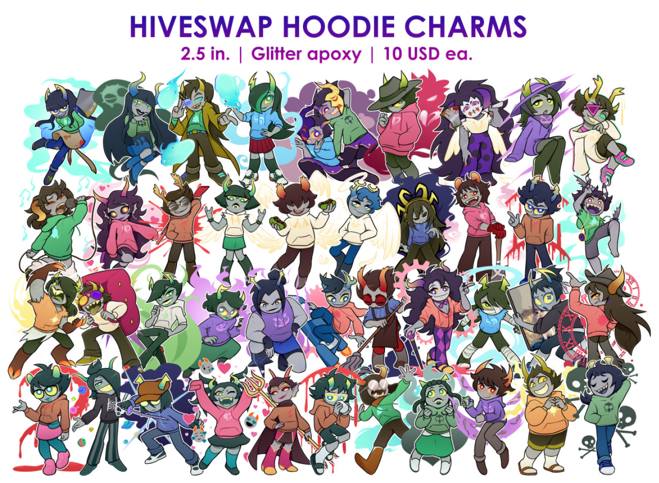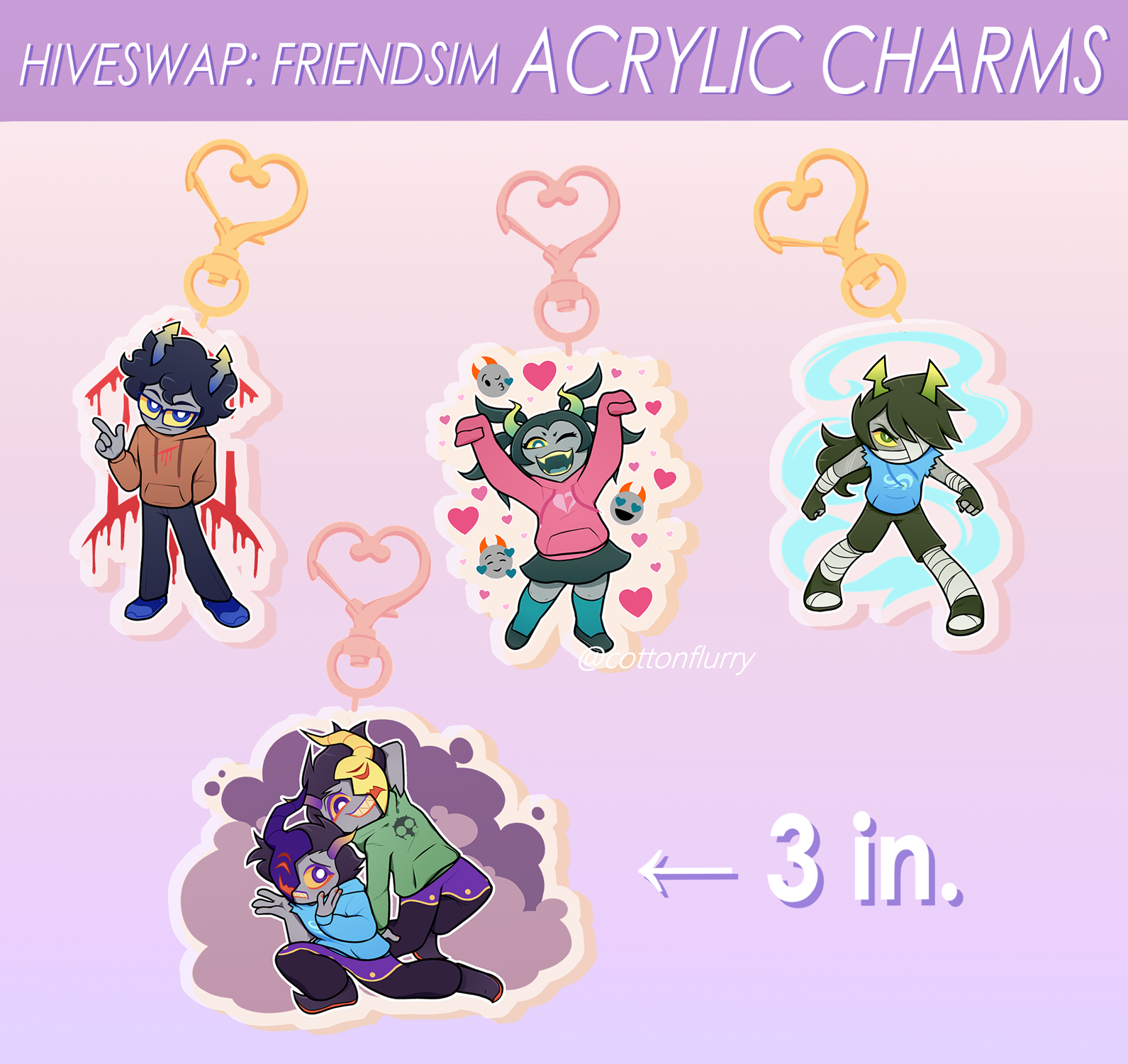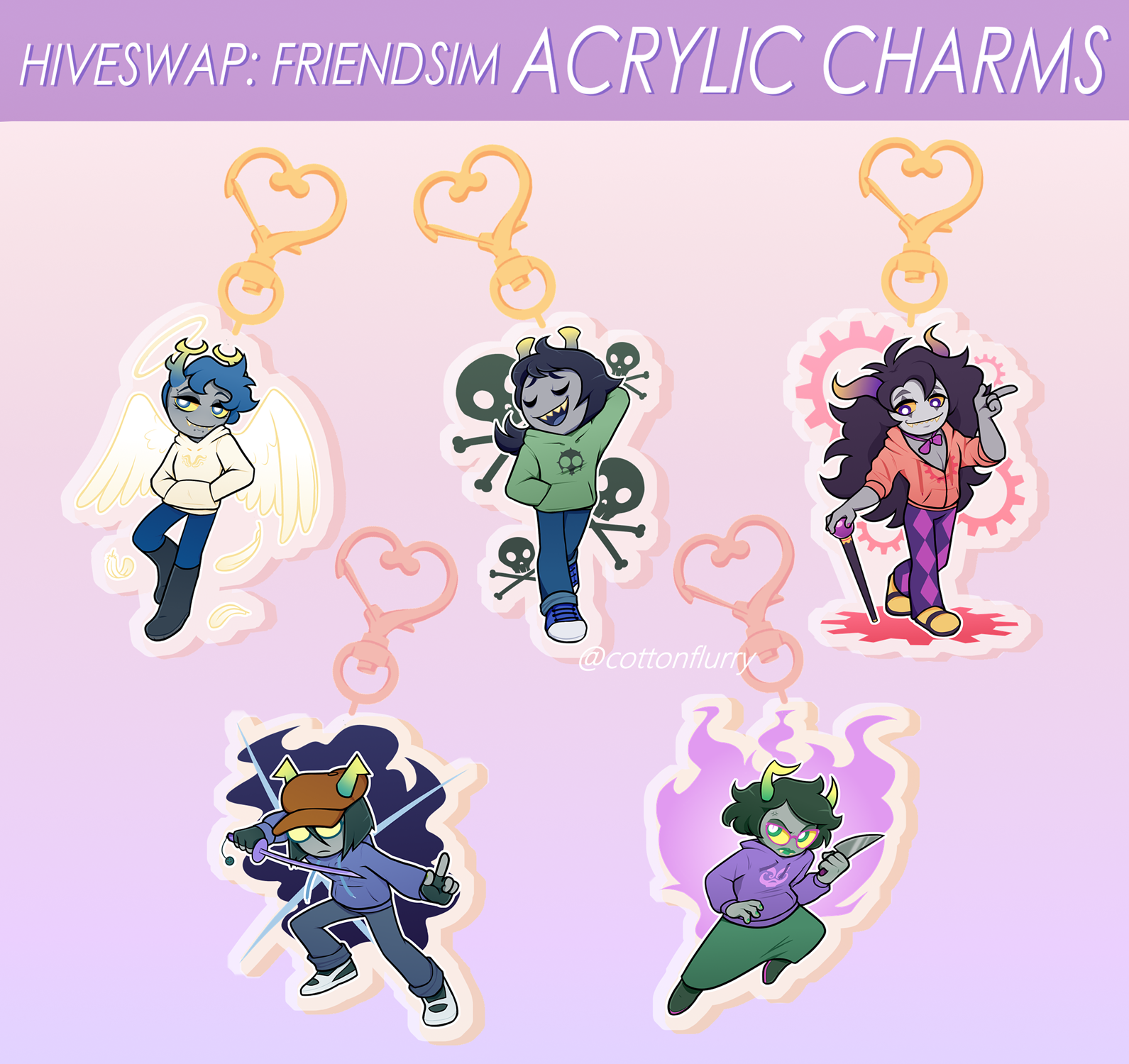 ♥ 2.5 in. glitter epoxy acrylic charms based on Hiveswap: Friendsim trolls ♥ Illustrated by cottonflurry on Twitter ♥ Double-sided print ♥ Gold heart accessory clasp for Prospit dreamers, Pink heart accessory clasp for Derse dreamers ♥♥