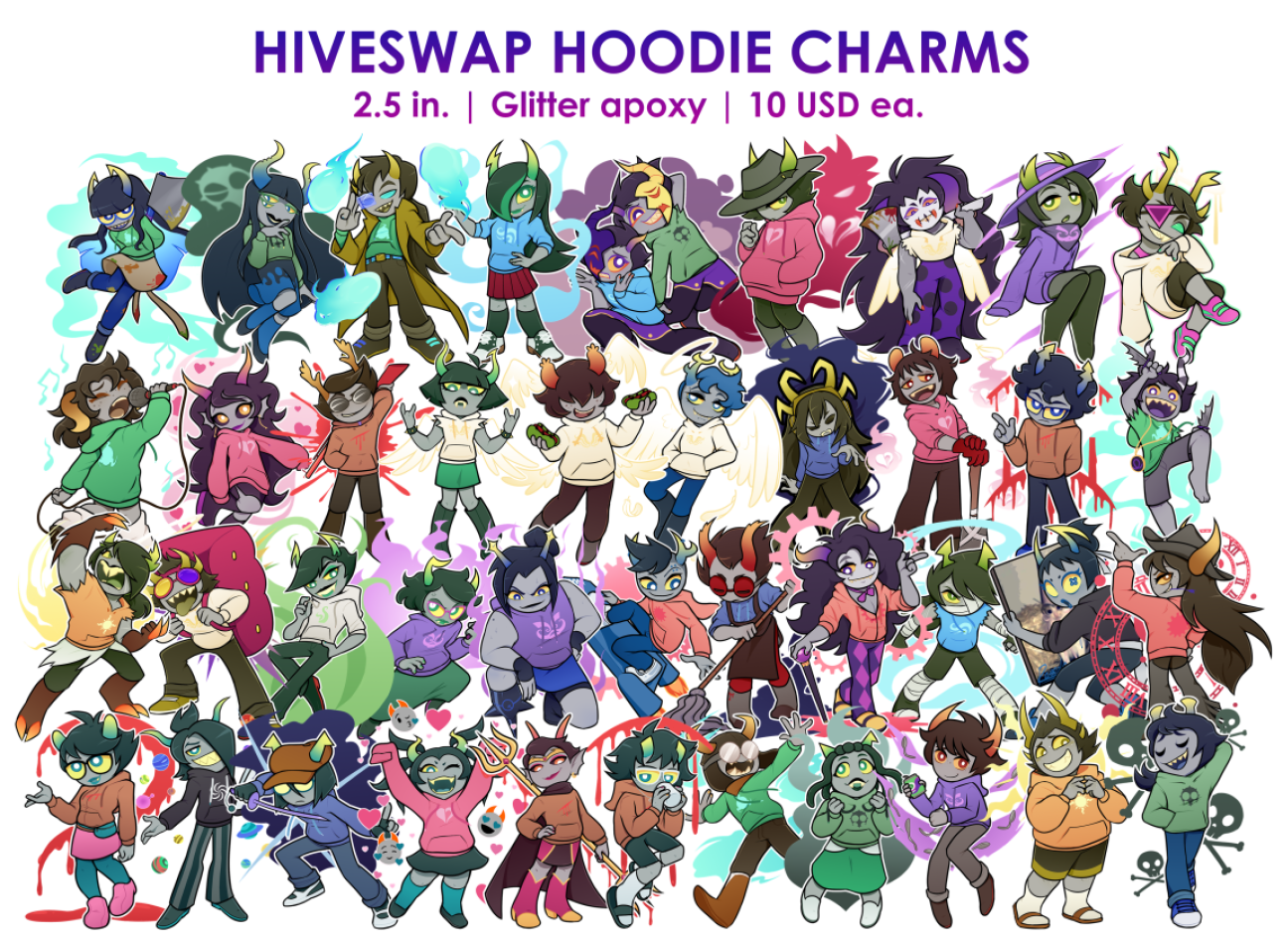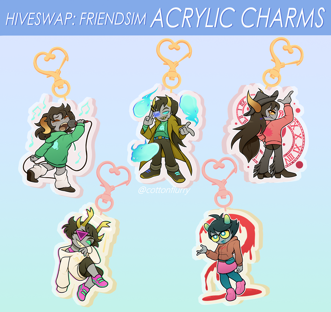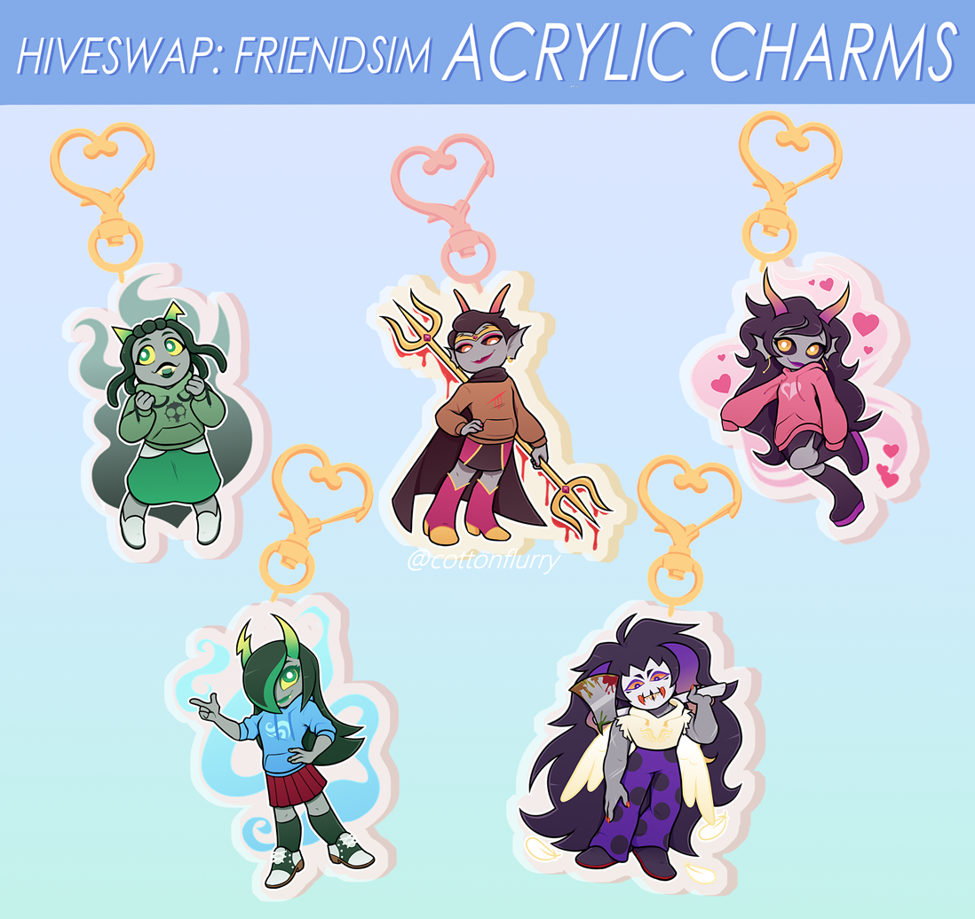 ♥ 2.5 in. glitter epoxy acrylic charms based off Hiveswap: Friendsim trolls ♥ Illustrated by cottonflurry on Twitter ♥ Double-sided print ♥ Gold heart accessory clasp for Prospit dreamers, Pink heart accessory clasp for Derse dreamers ♥