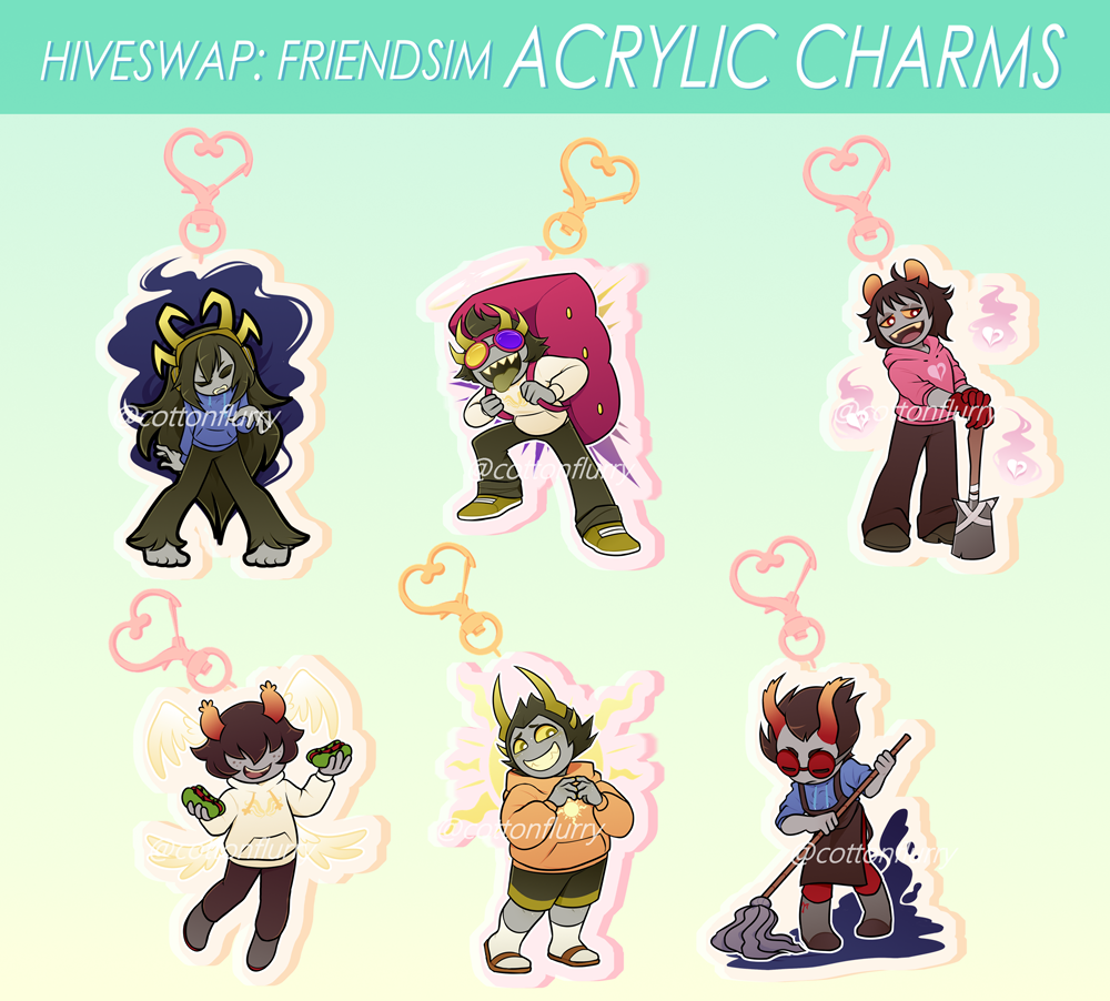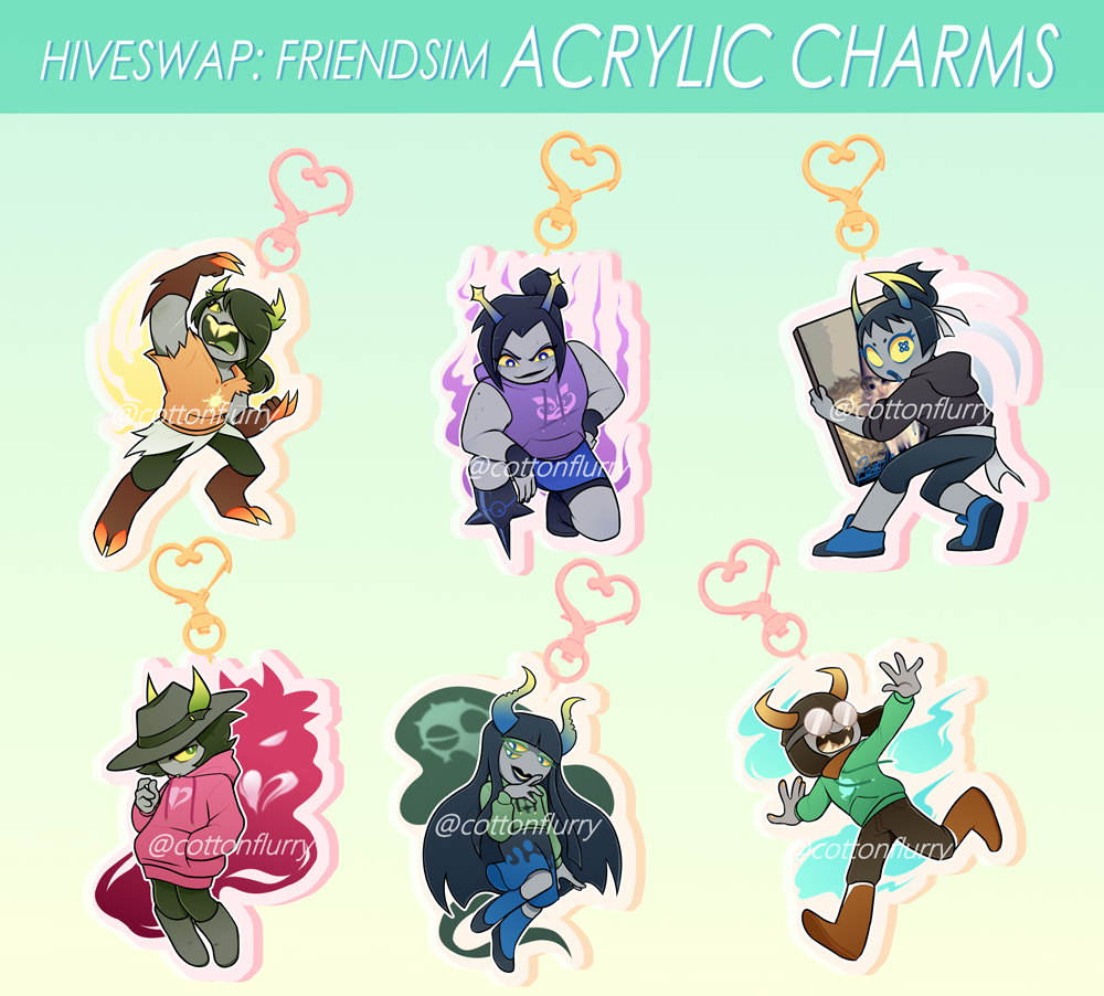 2.5 in. glitter epoxy acrylic charms based off Hiveswap: Friendsim trolls ♥ Illustrated by cottonflurry on Twitter ♥ Double-sided print ♥ Gold heart accessory clasp for Prospit dreamers, Pink heart accessory clasp for Derse dreamers ♥